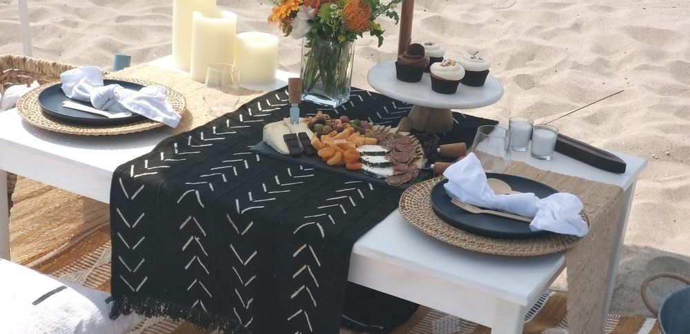 We provide elegant picnic rentals for our clients on the beaches of Santa Monica. Our set ups include chef's choice charcuterie board, bottled still water, sparkling water, decor, lighting, tableware, wireless speakers, polaroid camera, customizable chalk board.